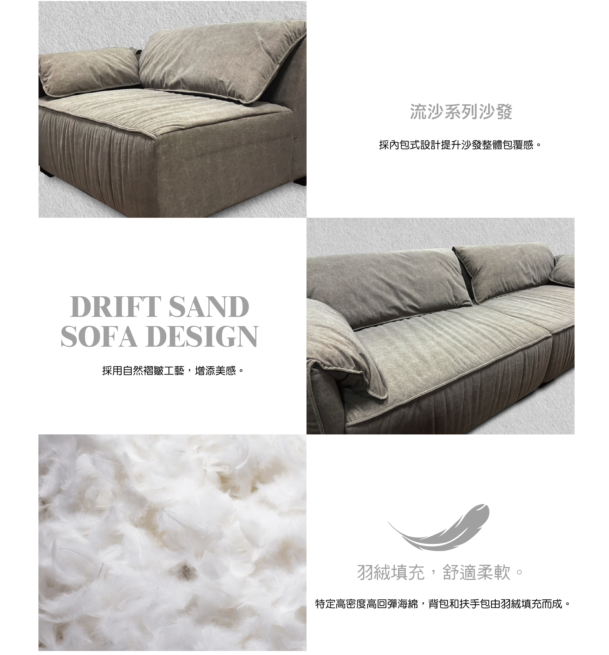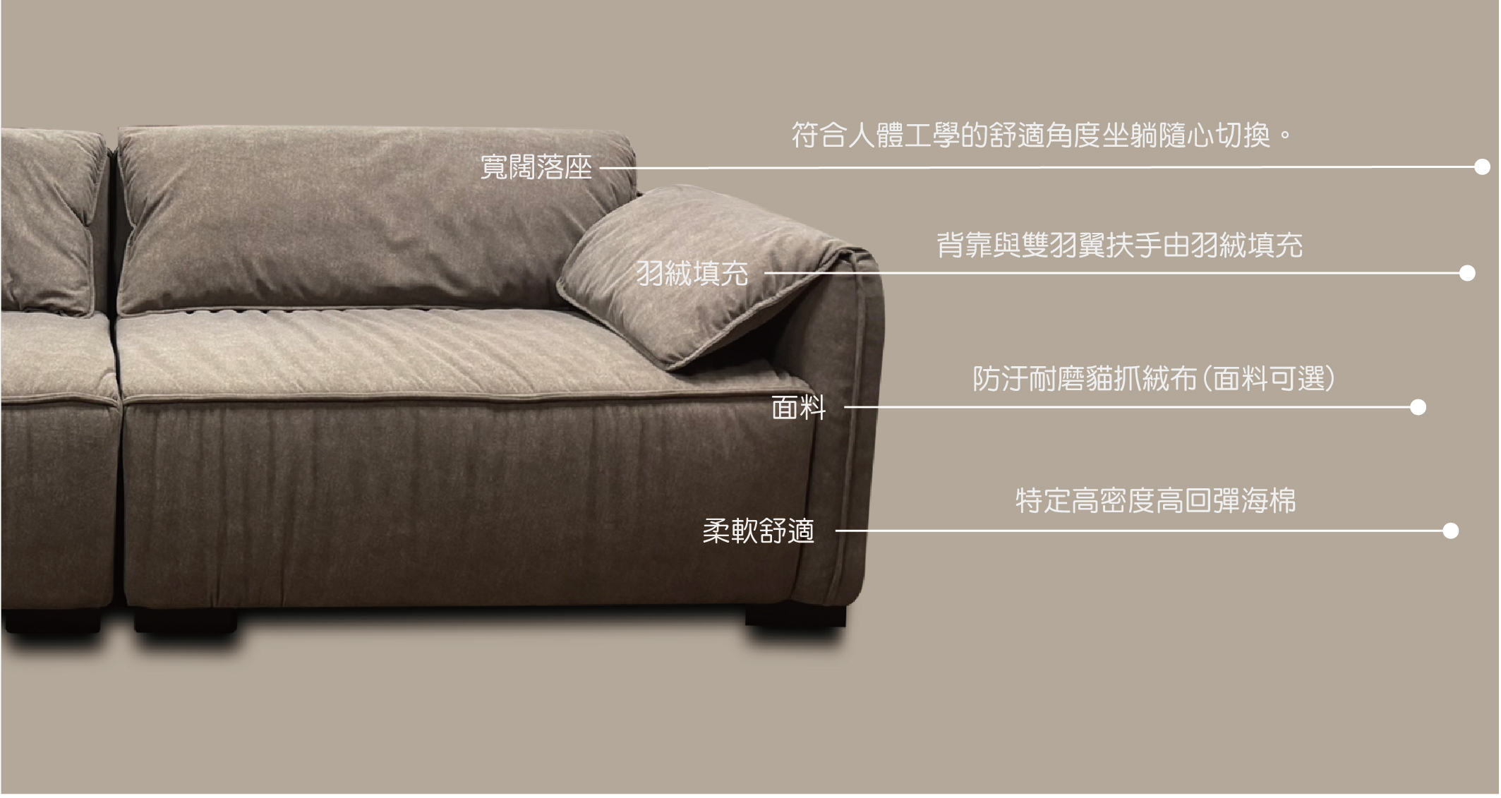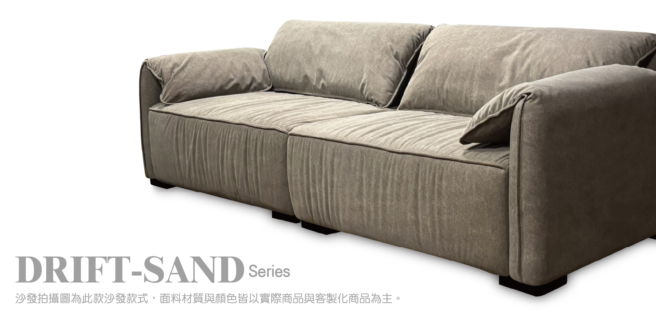 從沙發的面料(牛皮、科技牛皮、貓抓布、貓抓絨布、亞麻、泰迪系列材質)、 特定用色,提供客製化服務,滿足顧客居家佈置需求,讓空間生活美學更具個人化。