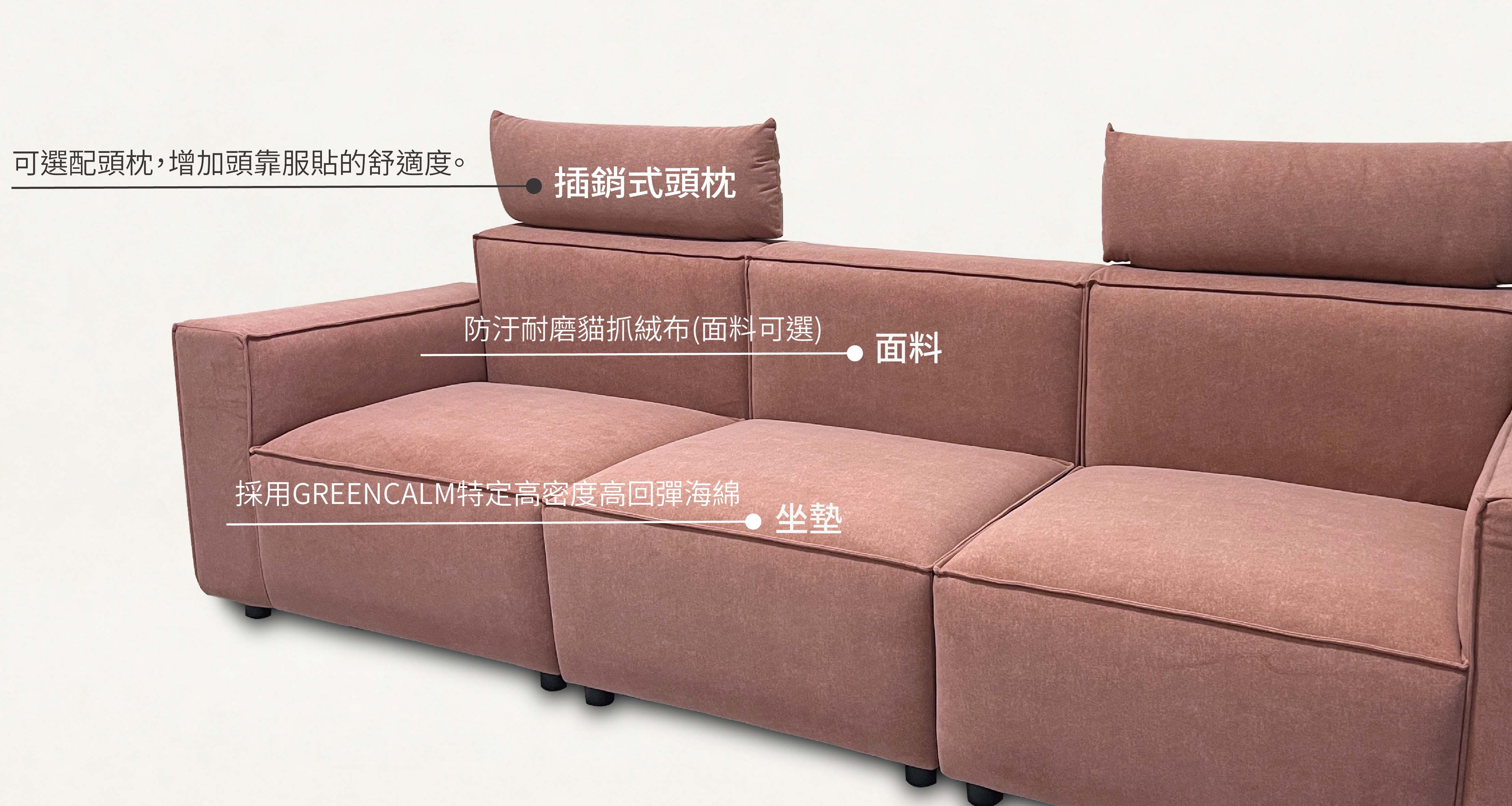 從沙發的面料 (牛皮、科技牛皮、貓抓布、貓抓絨布、亞麻、泰迪系列材質)、 特定用色,提供客製化服務,滿足顧客居家佈置需求,讓空間生活美學更具個人化。