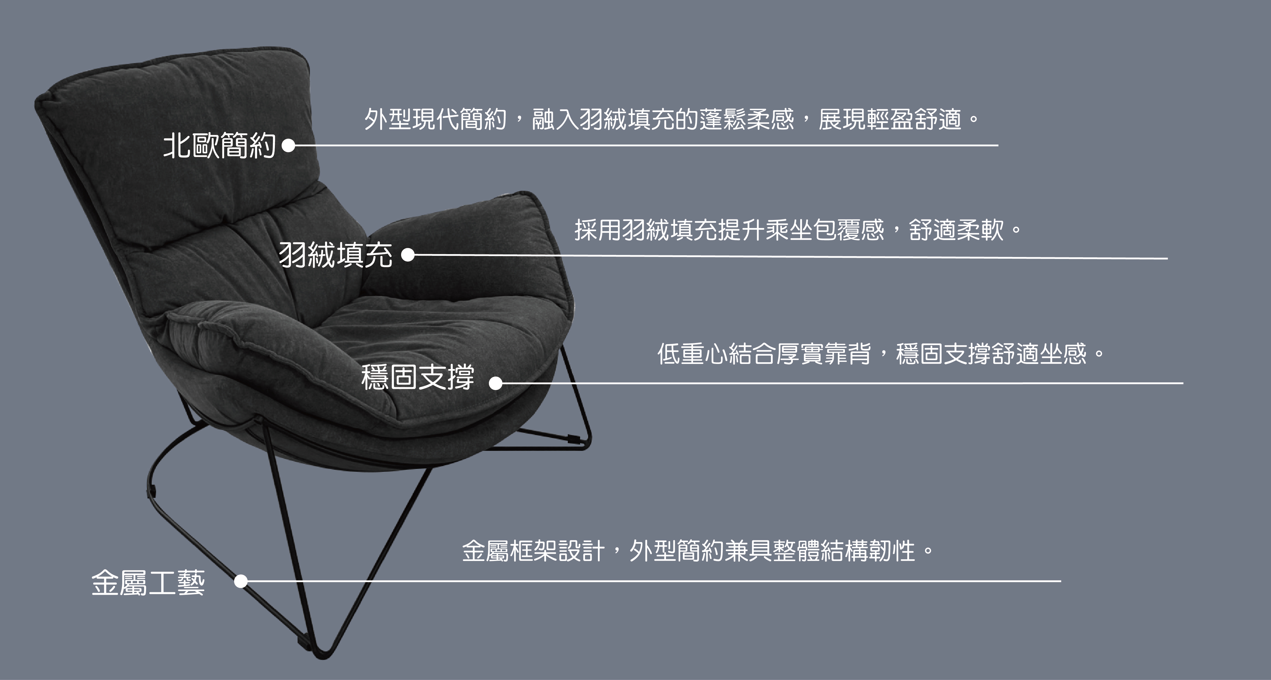 3.低重心與厚實靠背,坐墊採用白鵝羽絨填充提升乘坐包覆感。