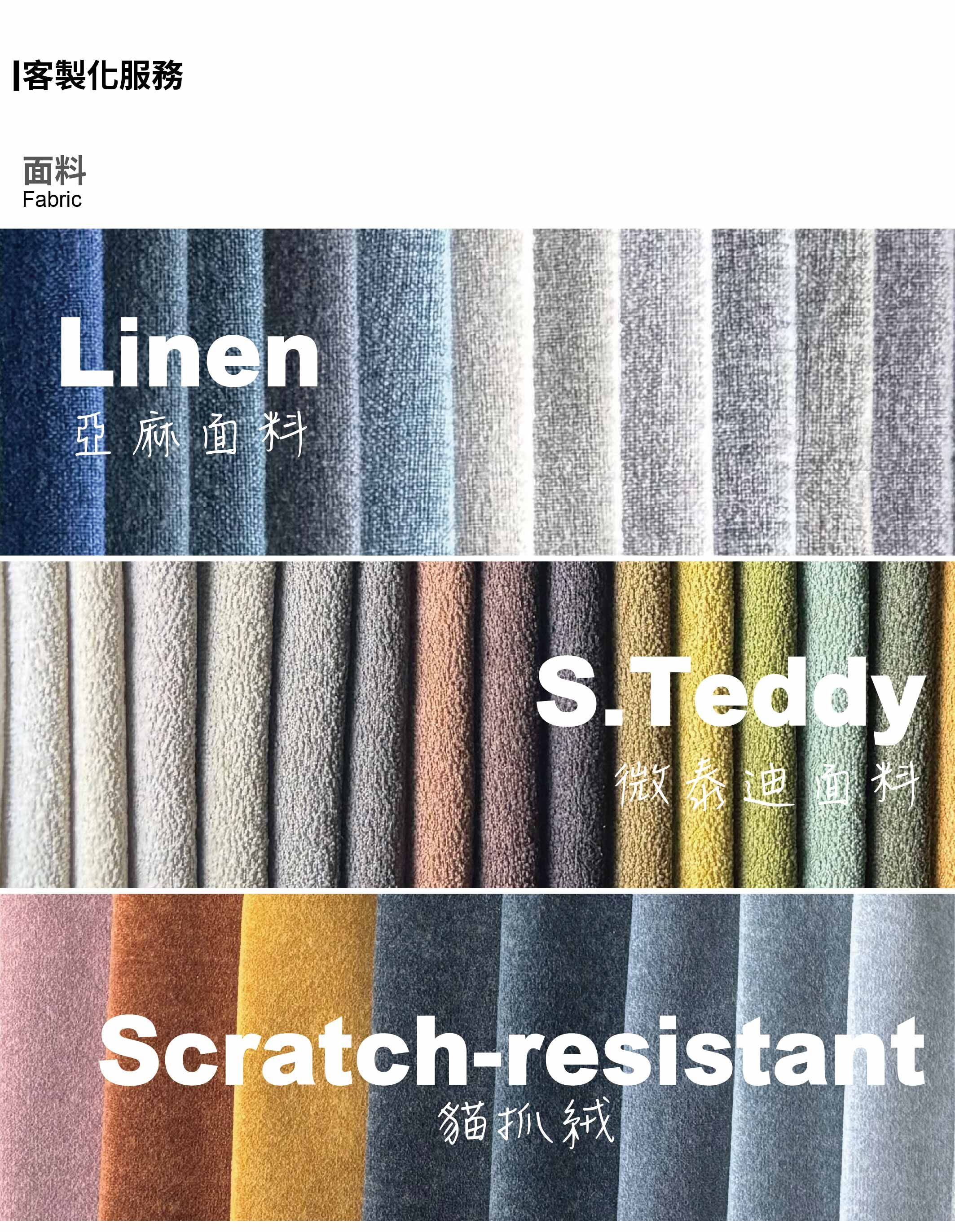 沙發的面料(貓抓絨布、亞麻、泰迪系列材質)、 特定用色,提供客製化服務,滿足顧客居家佈置需求,讓空間生活美學更具個人化。